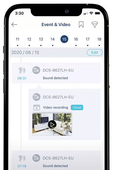 Acceda a todos los eventos y vídeos grabados y míralos en la aplicación mydlink. También puedes descargar tus vídeos en tu dispositivo y compartirlos.