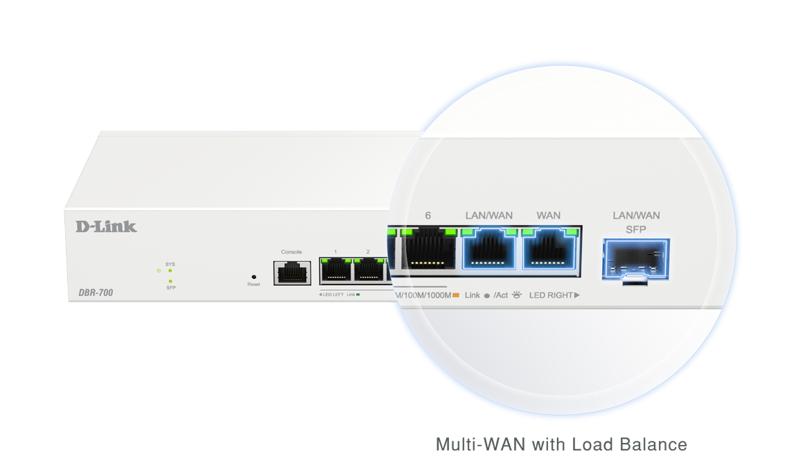 Con hasta 3 puertos WAN, el DBR-700 mantiene su negocio siempre conectado. El equilibrio de carga distribuye el tráfico de red entre varias conexiones WAN, lo que evita que una sola conexión se sature, equilibra el uso general de Internet y garantiza la continuidad con conexiones de respaldo en caso de fallas.