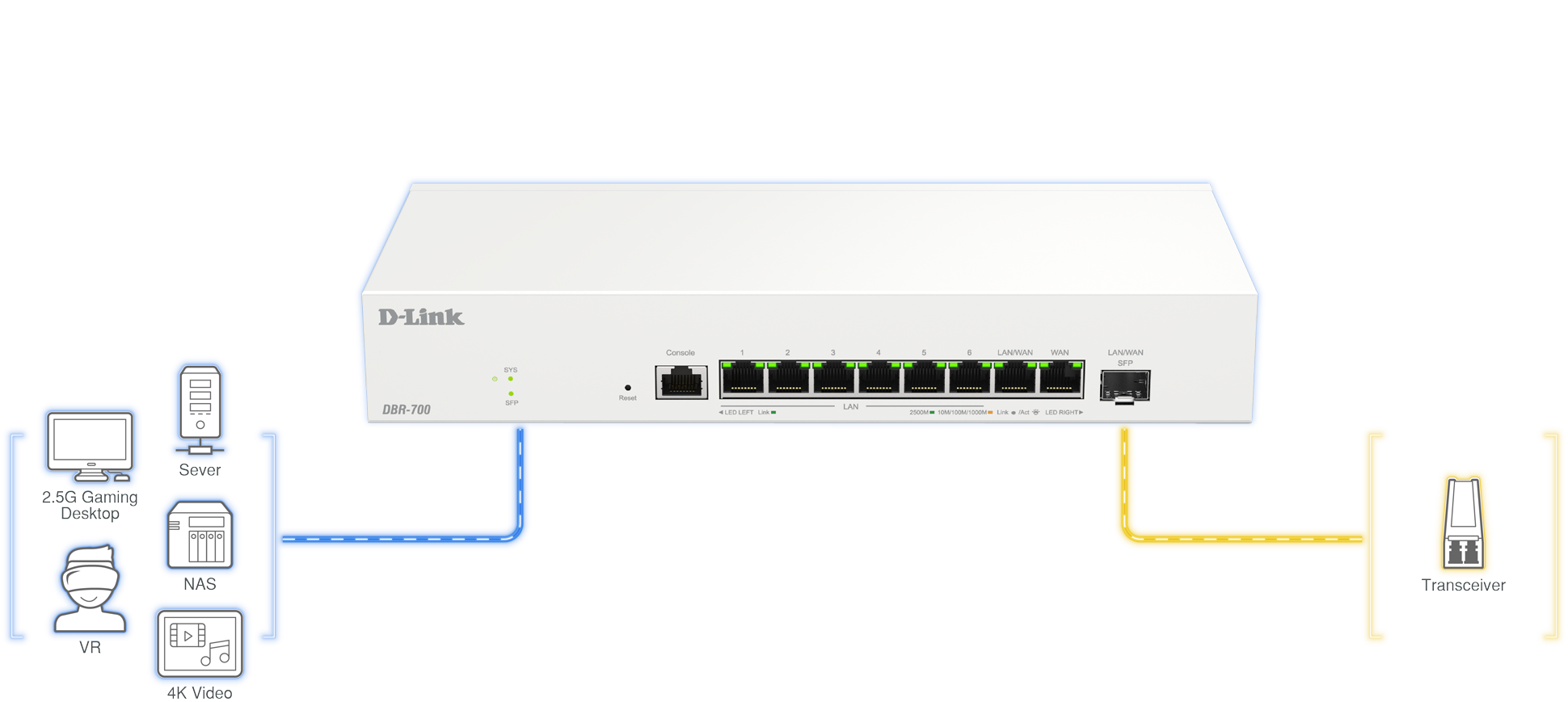 El DBR-700 cuenta con una interfaz 2.5G, que proporciona un mayor ancho de banda para admitir transferencias de archivos más rápidas y streaming de vídeo 4K/8K de alta calidad sin retrasos, lo que mejora la productividad diaria con una conectividad más estable y confiable. El puerto SFP (Small Form-Factor Pluggable) permite la transmisión de datos a larga distancia, lo que ofrece una mayor flexibilidad y escalabilidad en el diseño de la red. Con el puerto de fibra, las empresas pueden ampliar fácilmente su red sin limitaciones de zona.