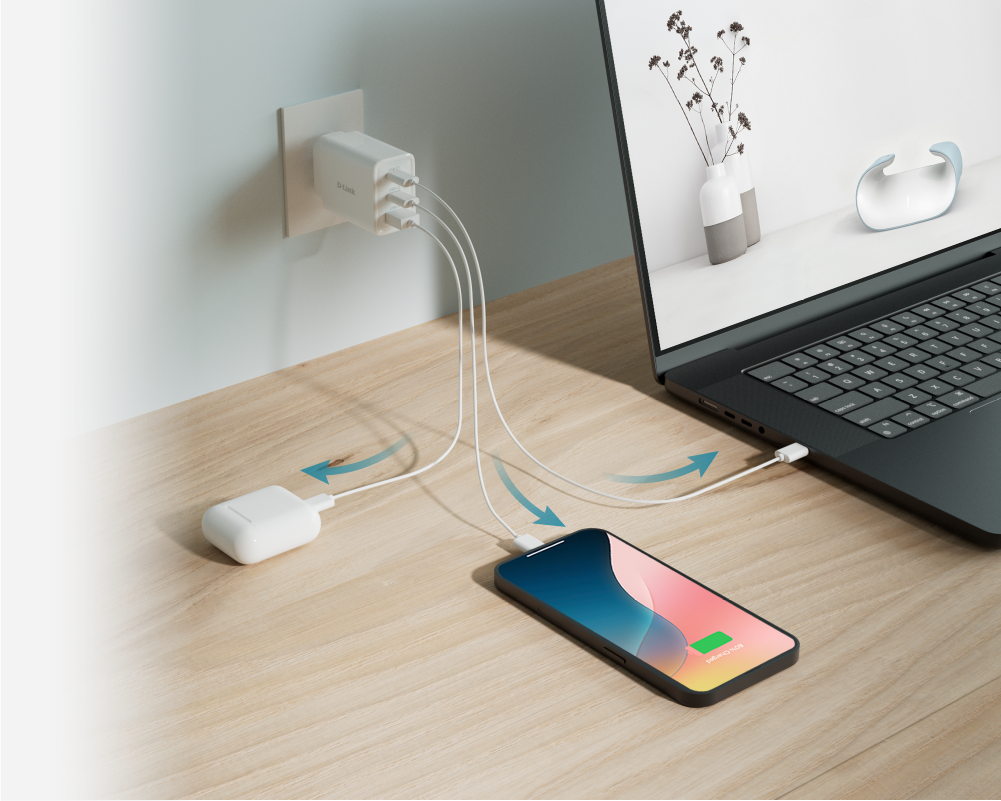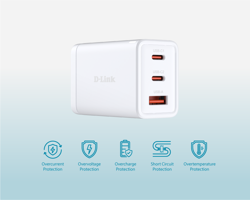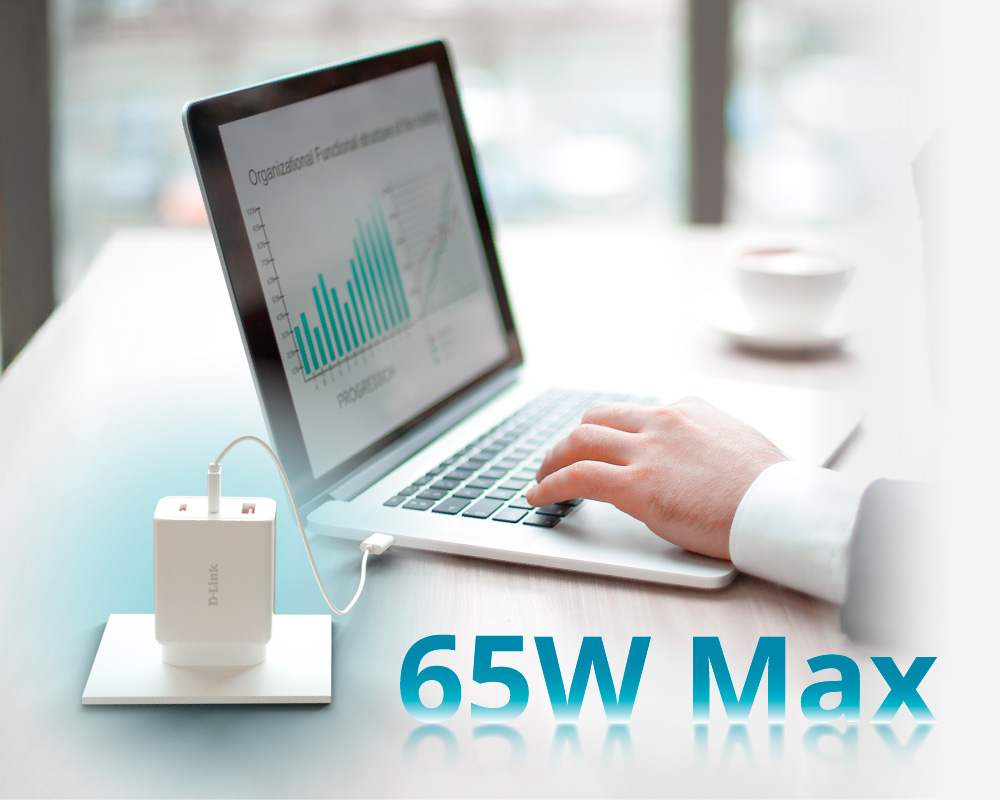 Descubra el cargador GaN de 65 W DCP-651 de D-Link, un cargador compacto y todo en uno diseñado para el trabajo, los viajes y el uso diario. Gracias a la tecnología GaN, ofrece hasta 65 W de carga eficiente para computadoras portátiles, tabletas y teléfonos celulares. Con dos puertos USB-C y enchufes intercambiables, es el cargador ideal para llevarlo a cualquier lugar.