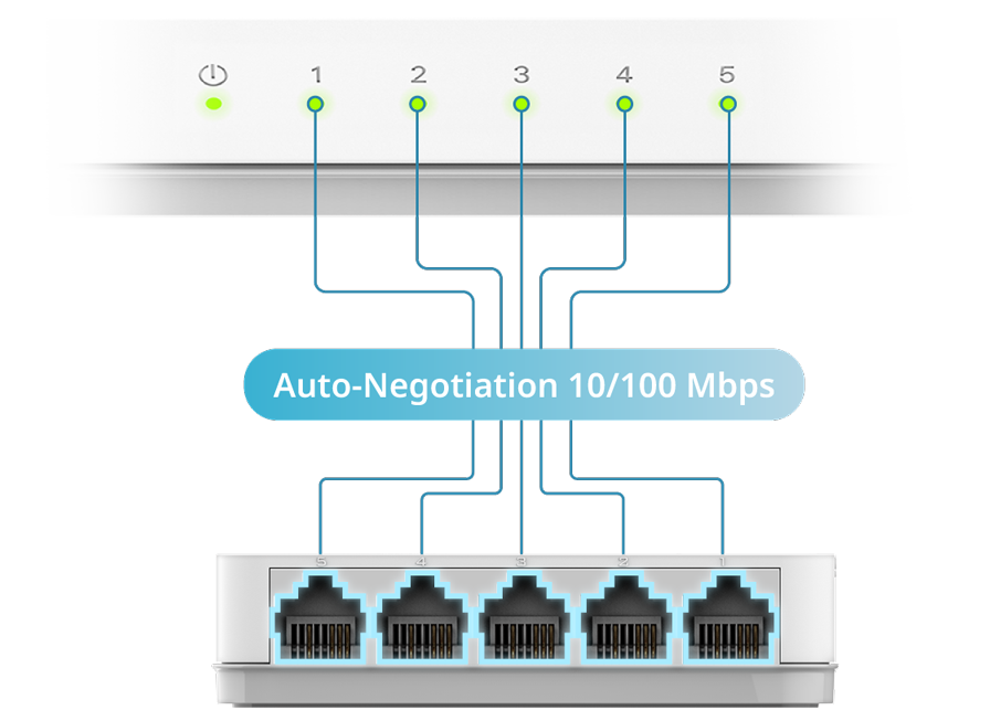El DES-1005A de D-Link utiliza puertos 10/100 Mbps con autonegociación, lo que permite a un pequeño grupo de trabajo conectarse de forma flexible a dispositivos Ethernet y Fast Ethernet para crear una red integrada.