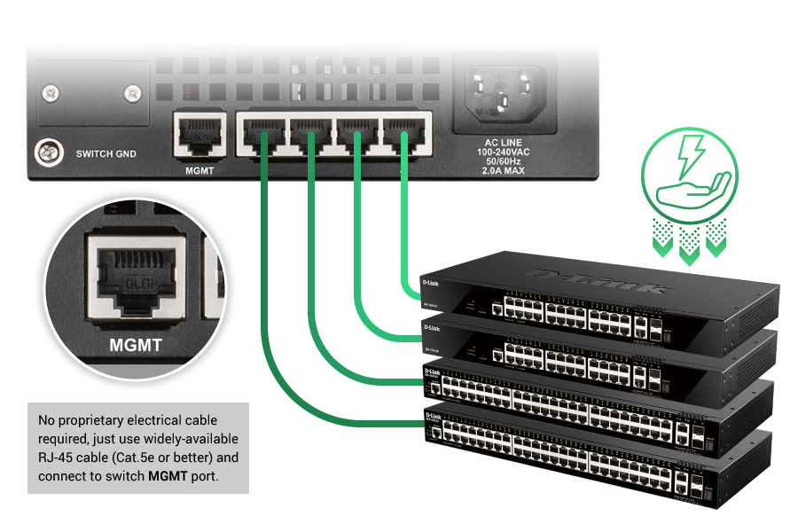 Para una infraestructura de red más resistente, conecte hasta cuatro switches DGS-1520 (solo modelos sin PoE) con el sistema de alimentación redundante PoE DPS-520 a través del puerto de administración y realice una copia de seguridad activa de cuatro dispositivos para reducir significativamente los costos de redundancia de energía.