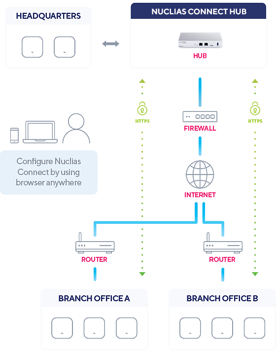 Dado que el software de Nuclias Connect opera de forma transparente en la red, se puede implementar un punto de acceso o un conmutador en cualquier lugar de un entorno NAT. Además, los administradores pueden proporcionar y gestionar diversas implementaciones distribuidas, incluyendo la opción de configurar ajustes y cuentas de administrador para cada implementación.