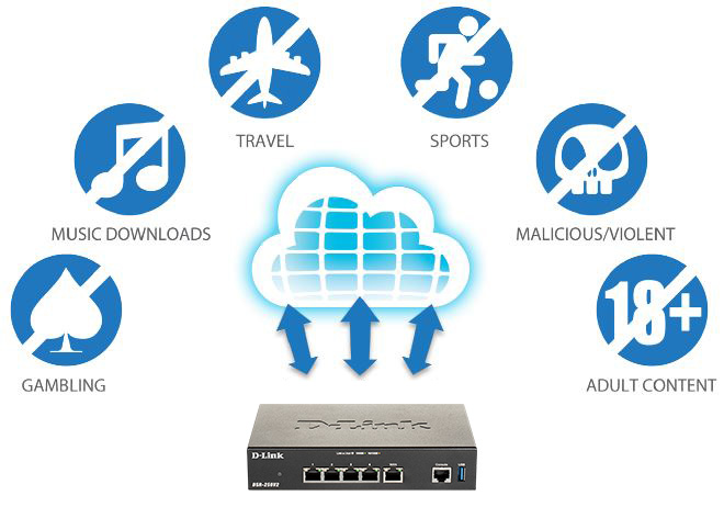 DSR-250V2 también proporciona una función de filtrado de contenido web para ayudar a los administradores a supervisar, administrar y controlar el uso de Internet de los empleados. El filtrado de contenido Web estático ayuda a eliminar objetos maliciosos tales como applets de Java, ActiveX y cookies, o a bloquear direcciones URL por palabra clave. El filtrado dinámico de contenido web, que requiere una suscripción de licencia, permite a los administradores filtrar contenido de una lista de categorías. Varios servidores de índice global, con millones de URL y datos de sitios web en tiempo real, mejoran el rendimiento y maximizan la disponibilidad del servicio.