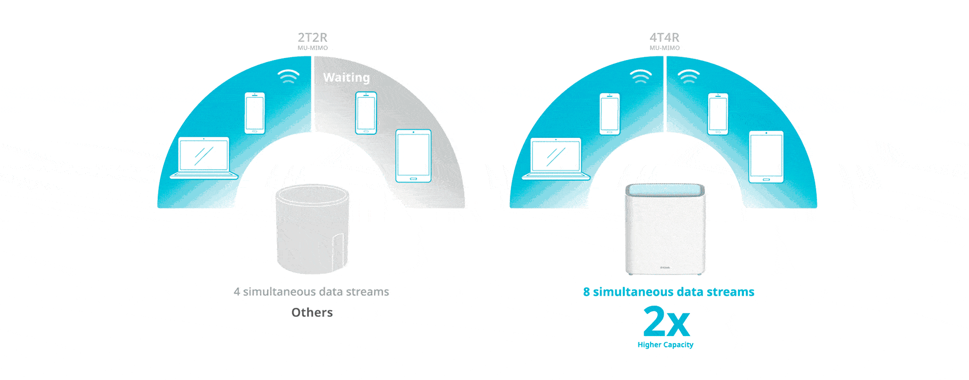 Wi-Fi 6 cuenta con tecnología MU-MIMO bidireccional para gestionar más usuarios simultáneos a velocidades de datos más rápidas, y capacidad de formación de haces para ampliar considerablemente el área de cobertura Wi-Fi.