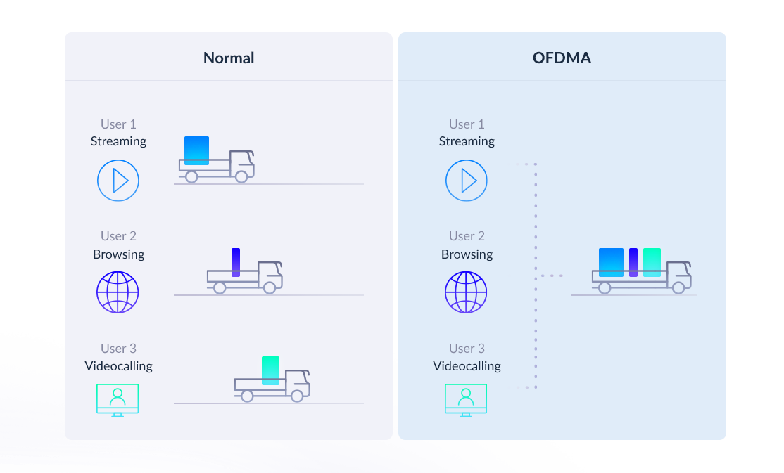 Los paquetes de datos pequeños destinados a múltiples dispositivos se transmiten juntos y nunca tienen que volver a ponerse en fila. Perfecto para dispositivos que consumen mucho ancho de banda y compiten por él.
